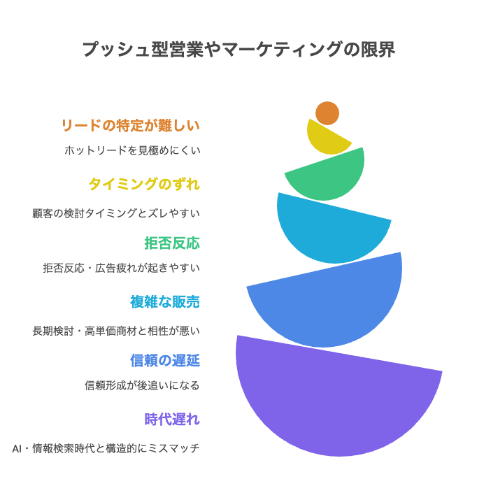 特にBtoBや高単価商材、検討期間が長い領域では、押し売り的なアプローチや広告の連投が逆効果になることも珍しくありません。ここでは、プッシュ型手法の構造的な限界と、なぜ“顧客育成”が今後の成果を分けるのかを具体的に整理します。