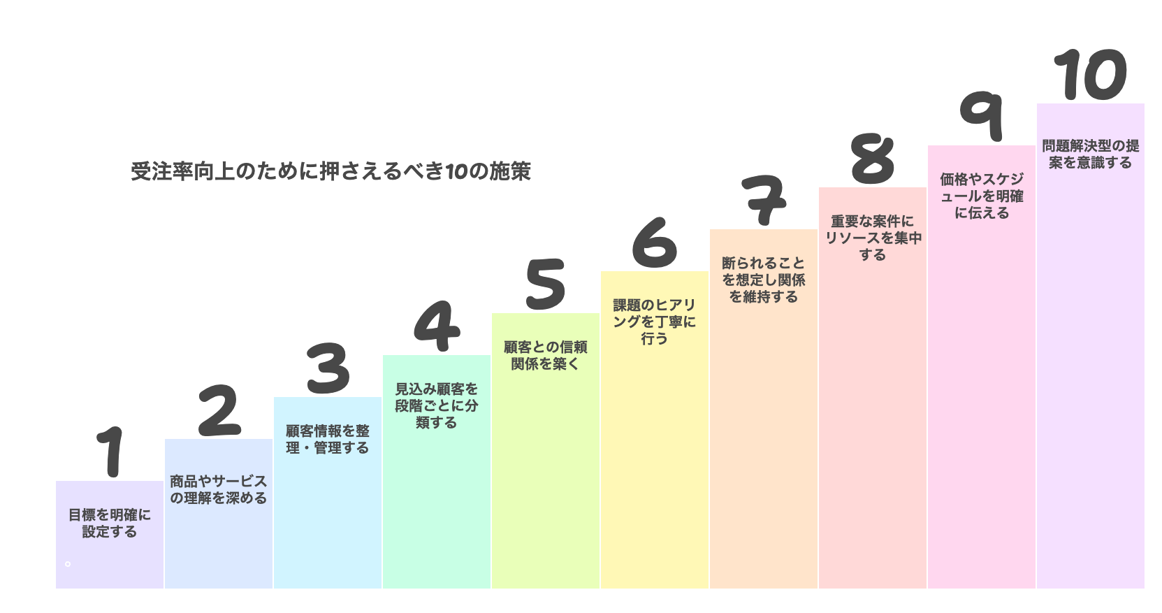 次の章では、受注率を向上させるために押さえるべき具体的な施策を10個ご紹介します。