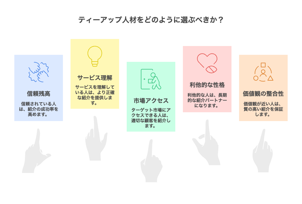 ティーアップ人材は「知り合いなら誰でもよい」わけではありません。紹介が成果につながるかどうかは、誰が推薦しているかで大きく変わります。そこで、以下の基準で候補を選定すると最も成功率が高まります。