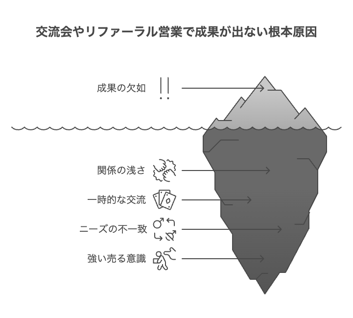 ここでは、なぜ交流会や紹介営業で成果が伸びにくいのか、その根本原因を整理し、それぞれの特徴をピックアップします。