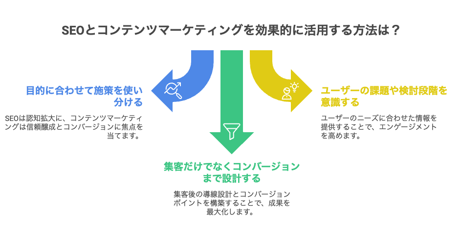 SEOマーケティングとコンテンツマーケティングは、単体で取り組むよりも両者を組み合わせることで本来の効果を最大化します。SEOで検索流入を増やした後、コンテンツマーケティングによってユーザーの興味・関心を深め、信頼醸成や購買意欲の育成へとつなげる流れが理想的です。