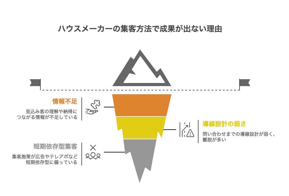 ハウスメーカーが集客施策を実施しても思うように成果が出ない背景には、いくつかの根本的な課題があります。見込み客の検討プロセスや意思決定の流れに寄り添えず、伝えるべき情報や案内の仕方が不十分になりがちです。