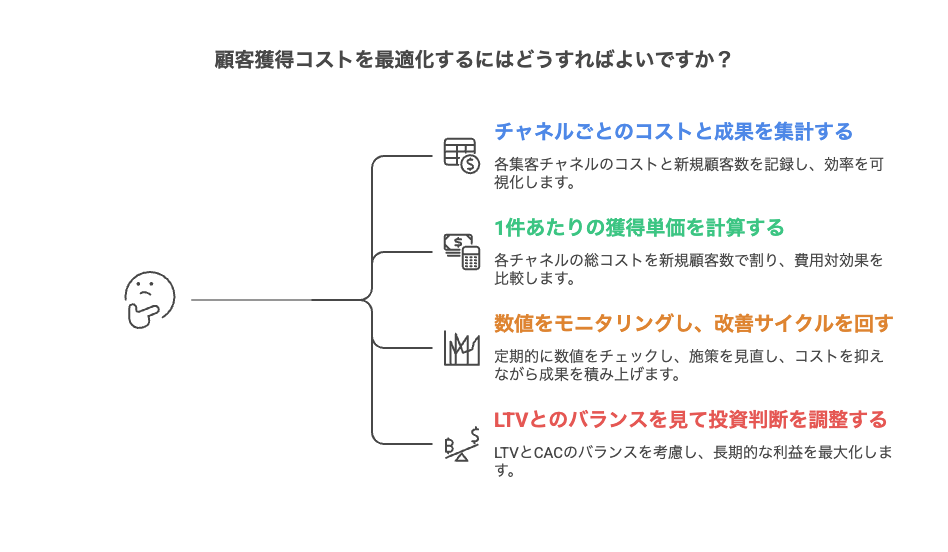 顧客獲得コスト(CAC)を最適化するには、単に総額を把握するだけでは十分とは言えません。集客チャネルごとに成果とコストを正確に分解し、1件あたりの獲得単価を算出、その数値を継続的にモニタリングしながら改善サイクルを回すことが不可欠です。