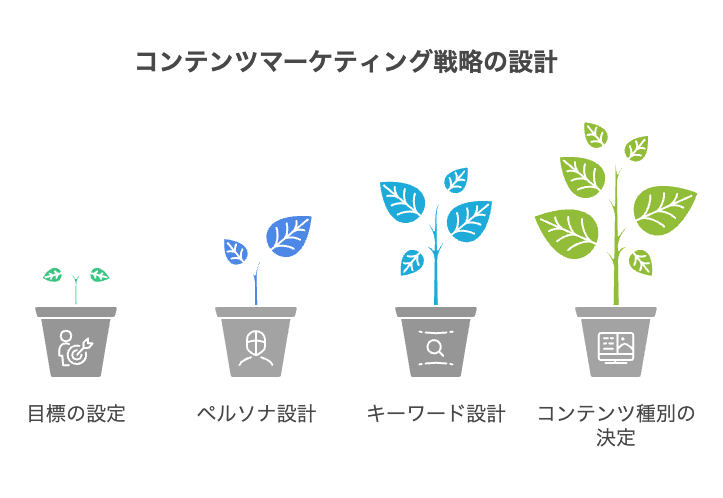 コンテンツマーケティングを成功させるには、作る前の設計が最も重要です。以下の4ステップで戦略を固めてから制作に入りましょう。
