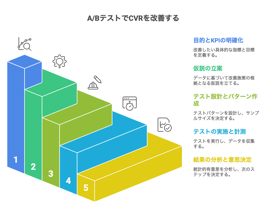 一方、BtoBサイトはBtoCと比べてトラフィックやリード数が少なく、テスト設計を誤ると「有意差が出る前に期間だけが過ぎる」という状態に陥りがちです。ここでは、成功確度を高めるための5ステップを順に解説します。