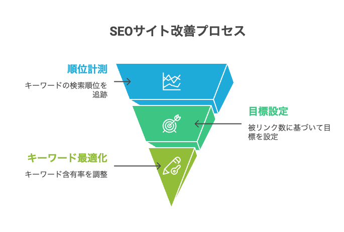 SEOチェキを活用したサイト改善は、単なる現状把握にとどまりません。キーワード選定から順位計測、被リンク数を踏まえた到達目標の設定、記事ごとのキーワード含有率最適化まで、一つひとつの作業が連動しています。